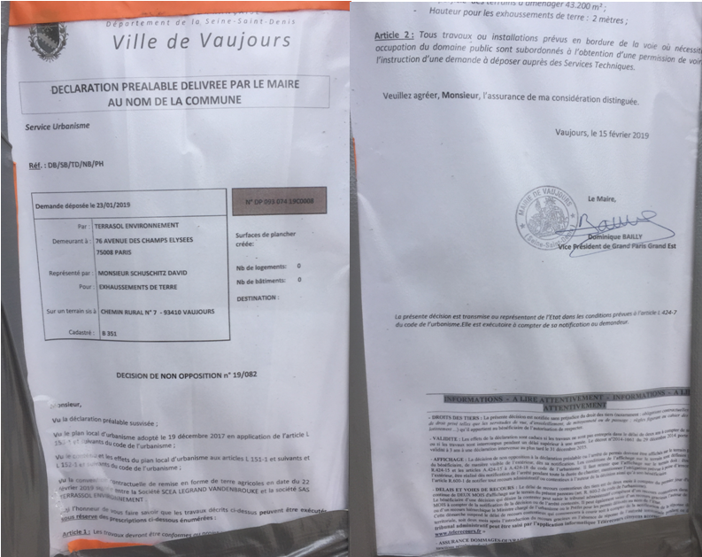 Par ailleurs un suivi régulier des photos aériennes proposées par Google Earth démontraient déjà que les terrains agricoles avaient été massacrés et que malgré la protection des terres agricoles annoncées dans les documents d’urbanisme, tels SCOT (Schéma de Cohérence Territoriale) de la MGP (métropole du Grand Paris), ou projet de PLUi (Plan local d’Urbanisme intercommunal) de l’Etablissement Public Territorial de Grand Paris Grand Est, la commune de Vaujours avait entériné ce type de pratique.